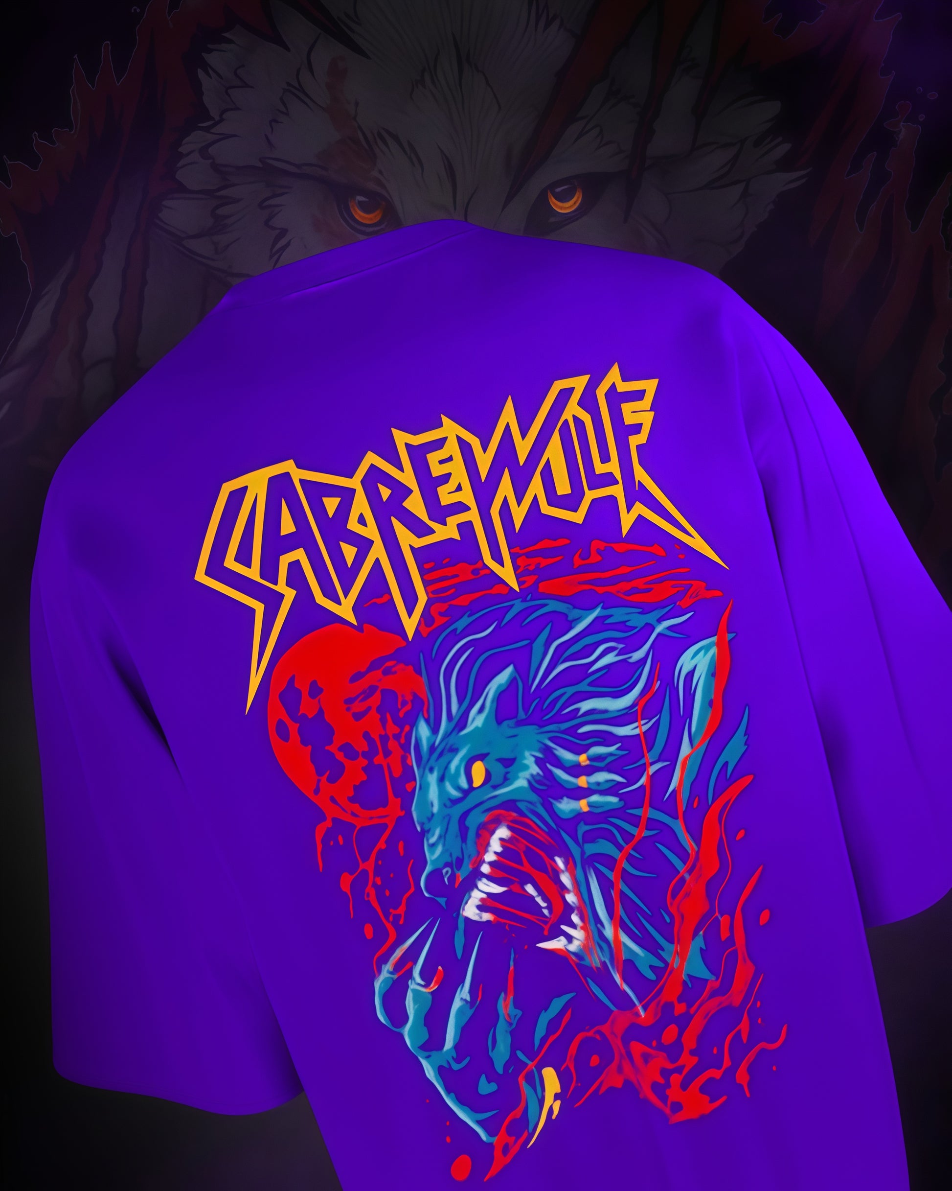 This oversized T-shirt showcases a striking Sabre Wolf design on the back, blending aggressive aesthetics with a retro-metal style font. The artwork features a snarling, blue-toned werewolf with sharp claws, set against a blood-red moon and dynamic splashes of red, adding to its intense, untamed vibe. The deep purple fabric enhances the contrast, making the design pop with fiery energy. The typography is sharp and jagged, reminiscent of heavy metal band logos, reinforcing the raw power of the design.